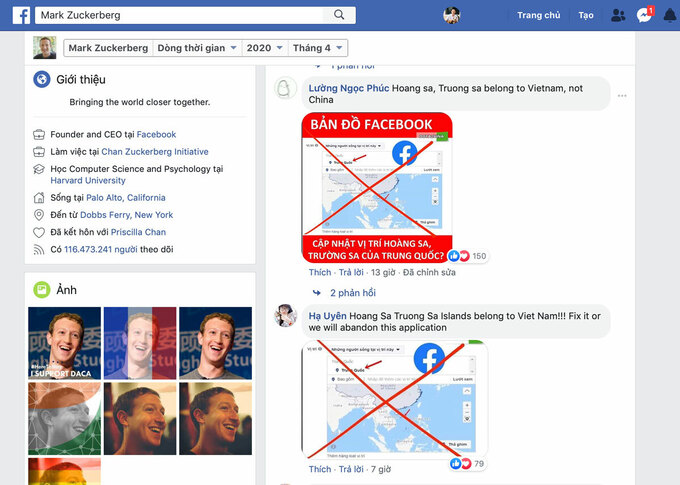 Người dùng vào cả trang cá nhân của CEO Facebook để phản ánh về bản đồ sai.