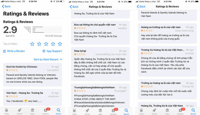 Ứng dụng Facebook trên App Store của Apple rớt từ "4 sao" xuống "2,9 sao", do bị người Việt đánh giá thấp từ sự cố Hoàng Sa, Trường Sa ngày 16/4.