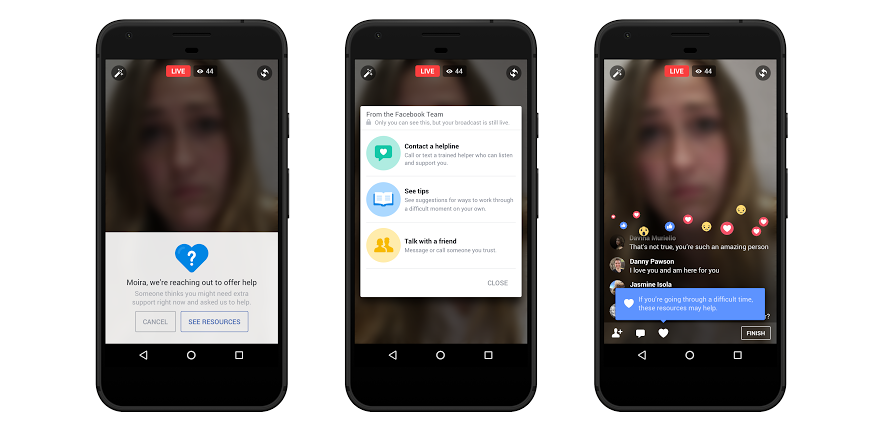 Công ty cho biết rằng họ đang bắt đầu ứng dụng trí thông minh nhân tạo để báo cáo và gỡ bỏ nội dung dựa trên bài viết đánh dấu là tự tử trước đây. Những cập nhật này được đưa ra sau khi một loạt vụ tự tử và giết người như vụ bắn người của cảnh sát ở Philando Castile, đã được xem trực tiếp trên Facebook kể từ khi tính năng này ra mắt cuối năm 2015.