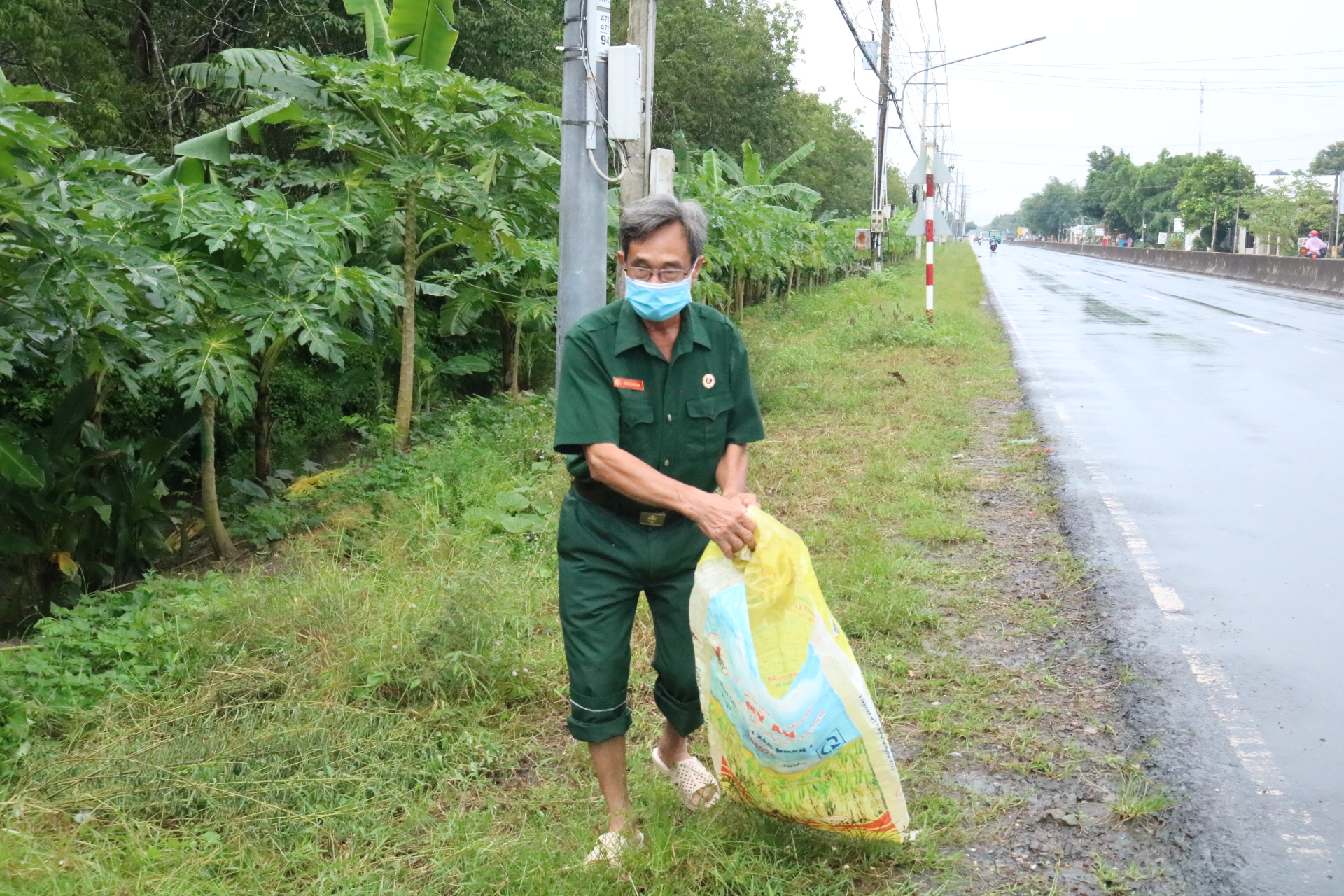 Ông Nguyễn Văn Kính nhặt rác dọc quốc lộ 22B đoạn qua xã Hiệp Thạnh.