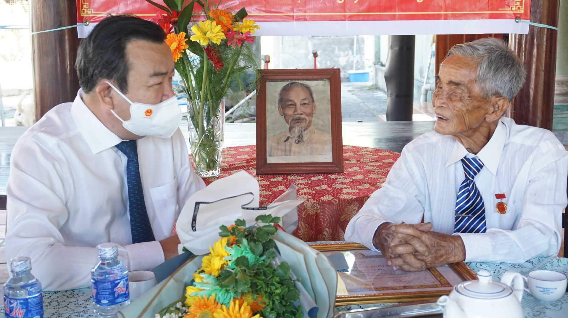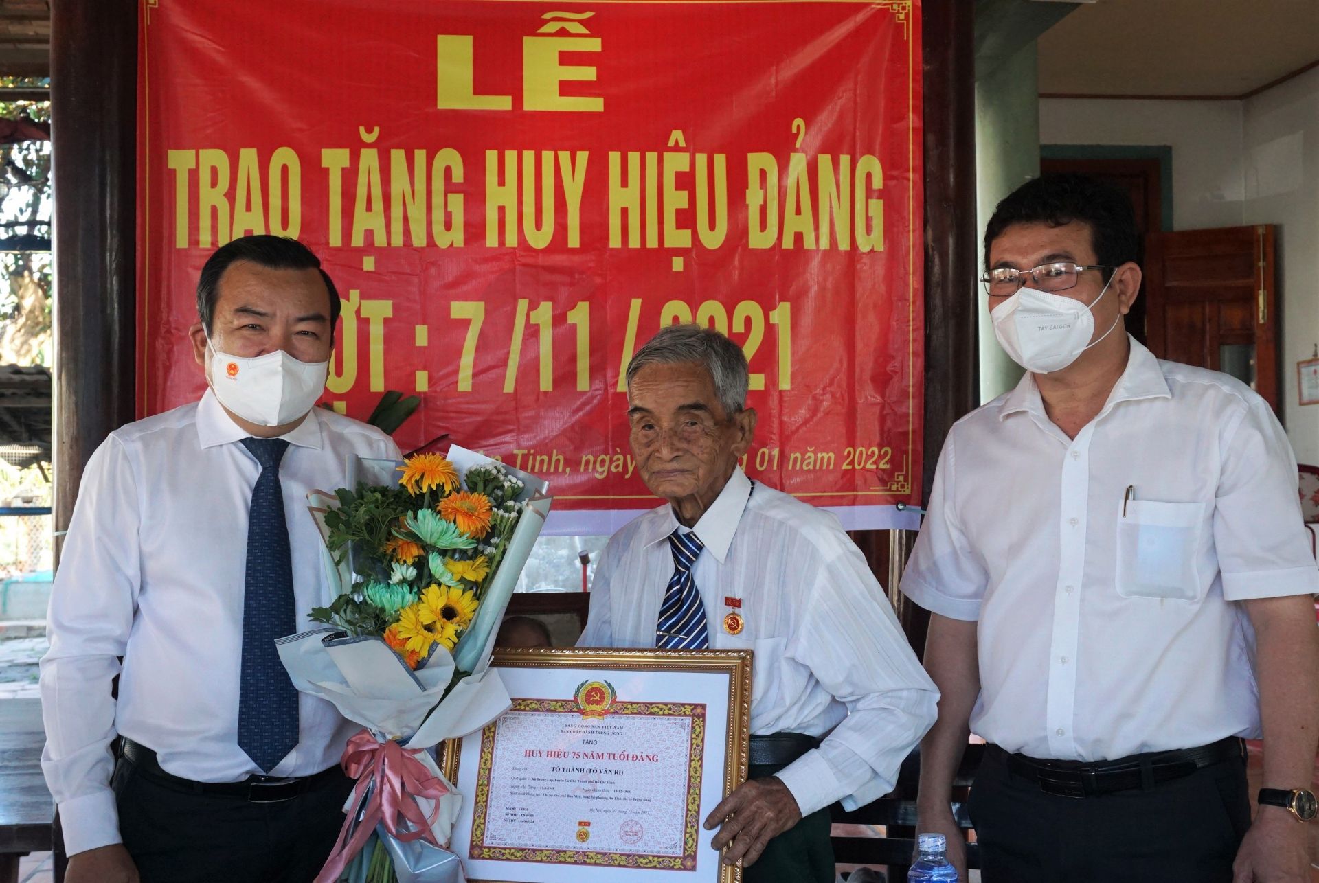 Phó Bí thư Thường trực Tỉnh uỷ Phạm Hùng Thái và lãnh đạo Thị uỷ Trảng Bàng trao Huy hiệu 75 năm tuổi Đảng cho đảng viên Tô Thành (tháng 1.2022)