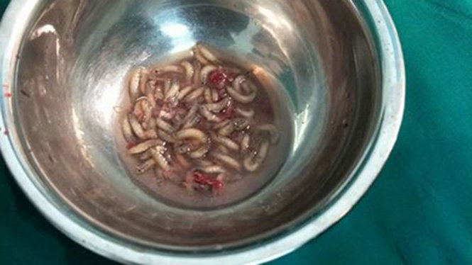 Ấu trùng bác sĩ gắp từ vết thương của bệnh nhân Kim - Ảnh: BVCC