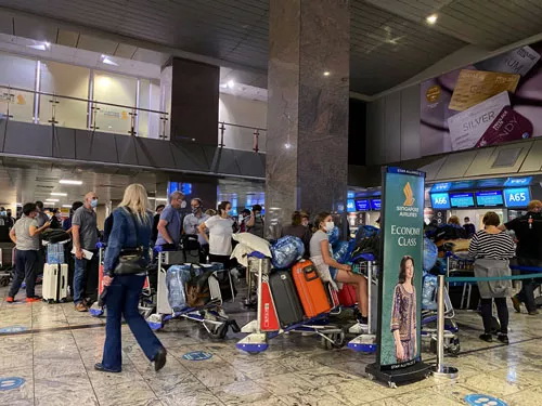 Hành khách xếp hàng chờ làm thủ tục khởi hành tại sân bay quốc tế ở TP Johannesburg - Nam Phi hôm 26-11 Ảnh: REUTERS