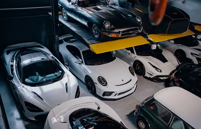 Trong garage luôn có những siêu xe, xe sang, thể thao hàng hiếm, đắt tiền. Đó là Jaguar E-Type, Porsche 356 Outlaw, Mercedes CLK63 Black Series, Ferrari 488 Misha Designs, McLaren 650s Darwin Pro và thậm chí cả chiếc Austin Mini Cooper S.