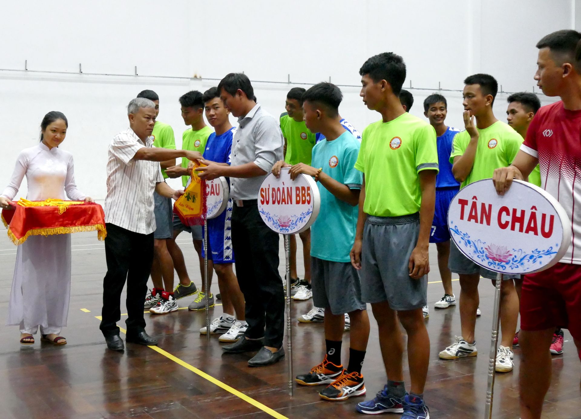 Tặng cờ lưu niệm cho các đội bóng tham dự giải tại lễ khai mạc.