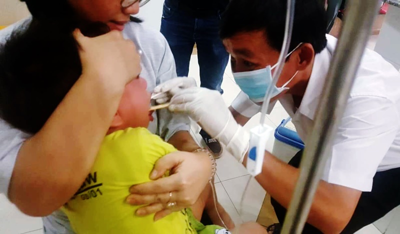 Cán bộ Trung tâm Kiểm soát bệnh tật Tây Ninh lấy mẫu bệnh phẫm ở bệnh nhi mắc TCM.