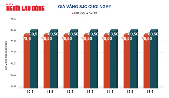 Tại Việt Nam, giá vàng SJC trong ngày 16-9 được giữ nguyên 80,5 triệu đồng/lượng. Giá vàng nhẫn bán ra tăng mạnh lên 79,2 triệu đồng lượng.