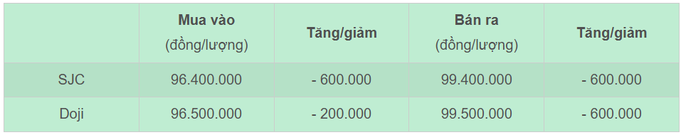 Còn giá vàng nhẫn 9999 tại Doji chốt phiên ở mức 96,7-100,1 triệu đồng/lượng, giảm 1,8 triệu đồng/lượng ở chiều mua vào và hạ 1,2 triệu đồng/lượng ở chiều bán ra so với mức chốt hôm trước.