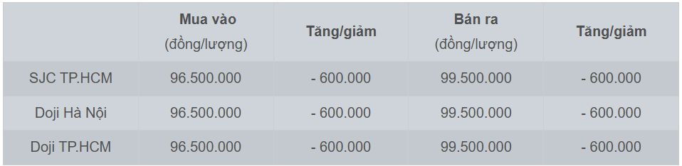 Tập đoàn Vàng bạc đá quý Doji sáng nay hạ giá vàng nhẫn 9999 về mức 96,5-99,5 triệu đồng/lượng (mua - bán), giảm 200 nghìn đồng/lượng ở chiều mua vào và hạ 600 nghìn đồng/lượng ở chiều bán ra so với kết tuần qua.
