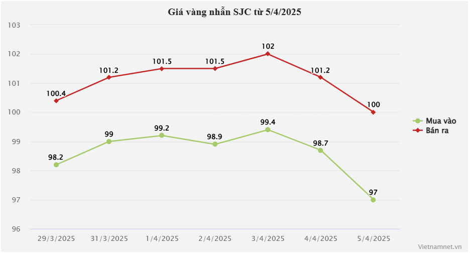 Kết phiên 5/4, giá vàng miếng tại SJC đóng cửa ở mức 97,1-100,1 triệu đồng/lượng (mua vào - bán ra), giảm 1,7 triệu đồng/lượng ở chiều mua vào và hạ 1,2 triệu đồng/lượng ở chiều bán ra so với kết phiên giao dịch trước đó.
