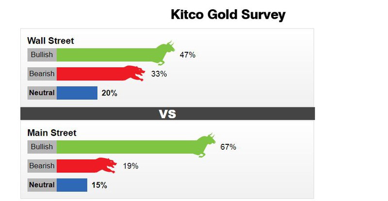 Theo khảo sát mới nhất của Kitco, 47% số chuyên gia Wall Street nhận định vàng sẽ tiếp tục tăng, 33% dự đoán vàng giảm và 20% cho rằng vàng sẽ đi ngang trong tuần giao dịch tới. Trong khi, tới 67% số nhà đầu tư Main Street tham gia khảo sát nhận định giá vàng tăng, 19% cho rằng giá giảm và 15% dự đoán vàng đi ngang.