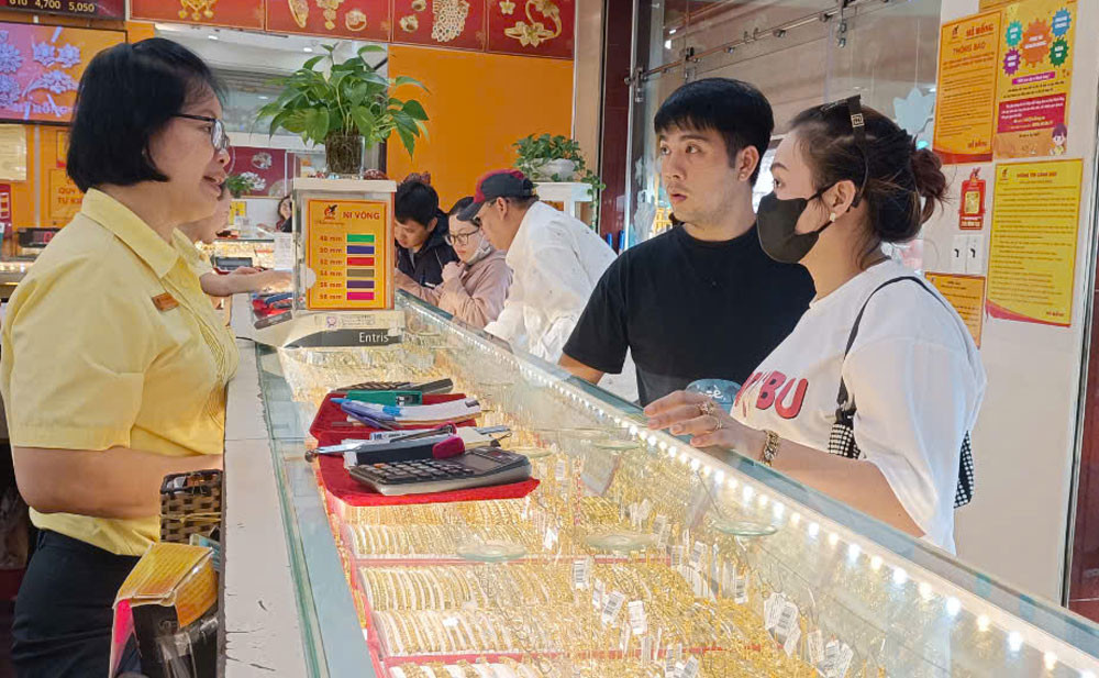 Khách giao dịch vàng tại cửa hàng Mi Hồng.