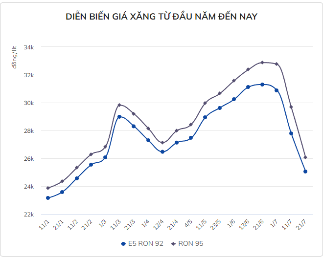 Từ 15h ngày 21/7, giá xăng E5 RON 92 trong nước giảm 2.710 đồng/lít còn 25.070 đồng/lít, xăng RON 95 giảm 3.600 đồng/lít còn 26.070 đồng/lít. Đây là lần giảm mạnh nhất của giá xăng từ đầu năm.