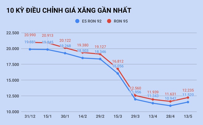 Trong kỳ điều hành giá gần nhất hôm 28/4, giá xăng E5 RON 92 giảm 401 đồng/lít, từ 11.343 đồng/lít xuống 10.942 đồng/lít; xăng RON 95 giảm 308 đồng/lít, từ 11.939 đồng/lít xuống còn 11.631 đồng/lít, thấp nhất trong vòng 13 năm.