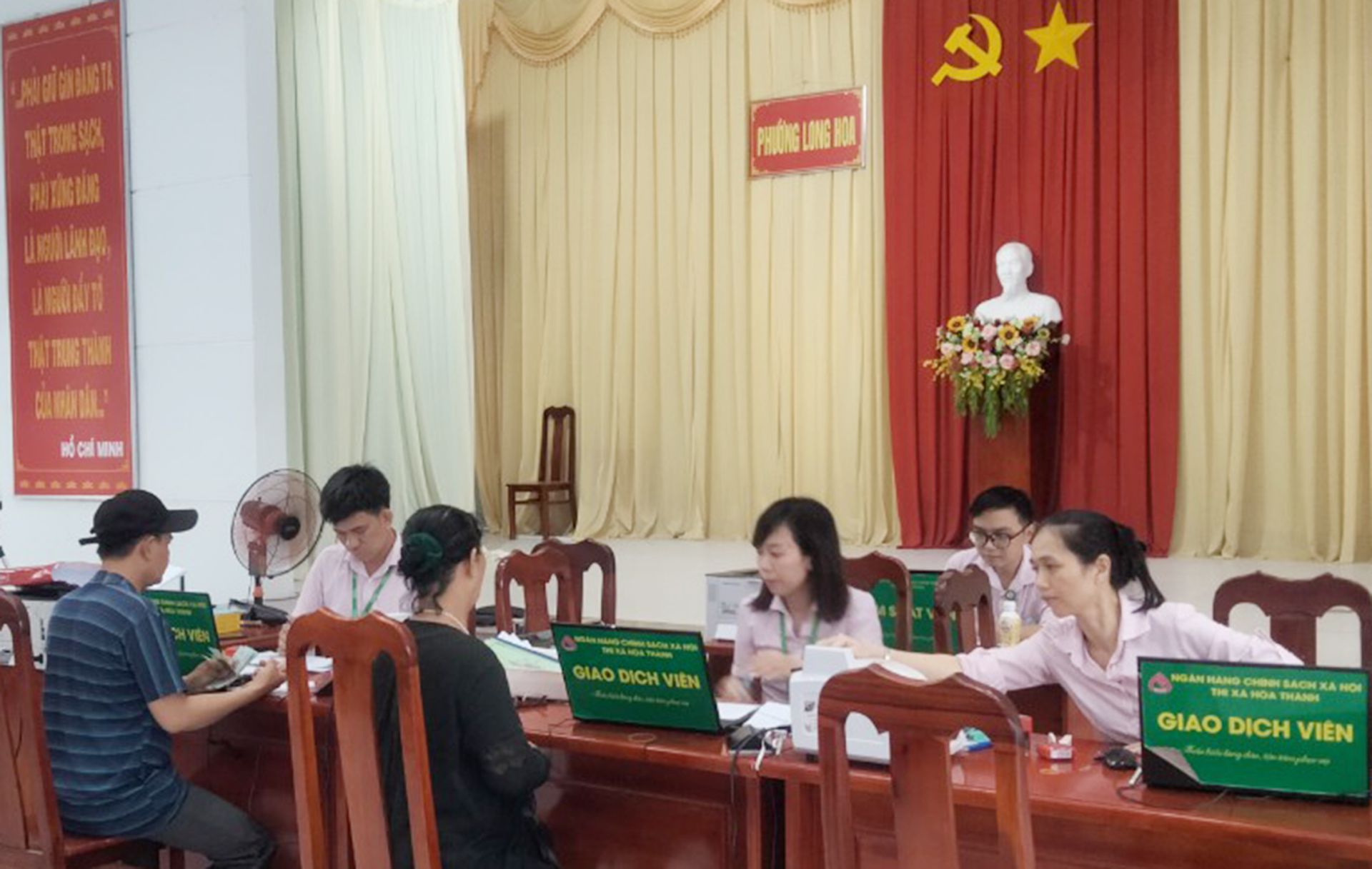 Giao dịch viên Ngân hàng Chính sách xã hội thị xã Hoà Thành giải ngân vốn cho hội viên nông dân phường Long Hoa.