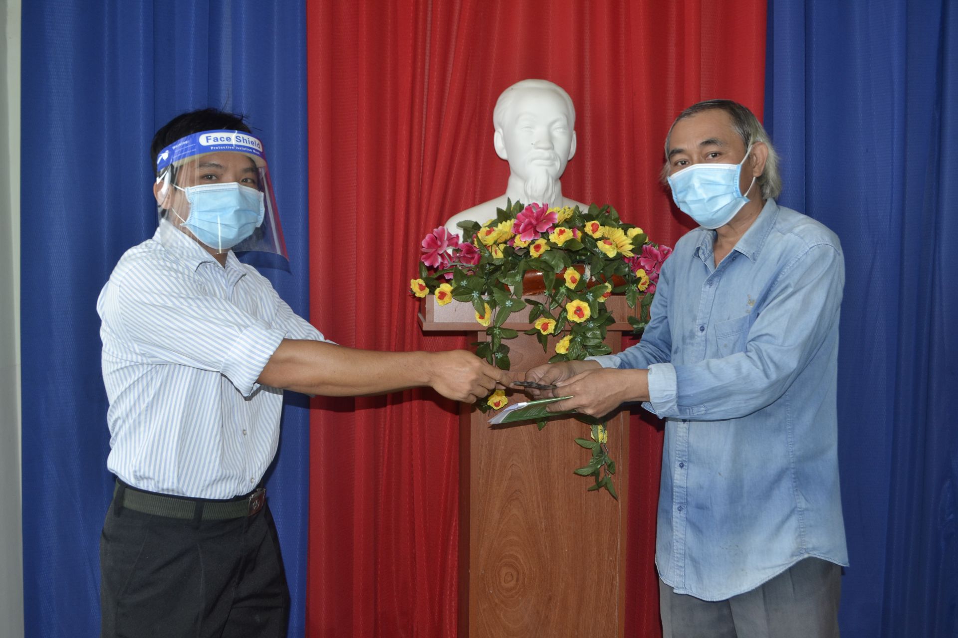 Ông Lê Tùng Chinh – Chủ tịch Hội Nông dân phường Long Hoa (bên trái) trao nguồn vốn cho hội viên.