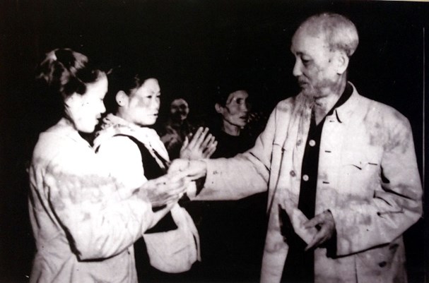 Chủ tịch Hồ Chí Minh tặng hoa phong lan cho ba đại biểu nữ dân quân Quảng Bình và Vĩnh Linh, năm 1968.