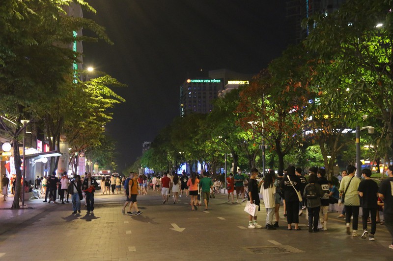 Nguyễn Quỳnh Như (20 tuổi) và Võ Thành Trung (21 tuổi) ngồi hóng mát khu vực bên lề phố đi bộ. Trung và Như cho biết mọi năm bận đi làm nên không đi chơi được, năm nay là lần đầu đến phố đi bộ đón giao thừa. Đặc biệt Trung và Như đến phố đi bộ với mong muốn được xem chương trình Vũ khúc ánh sáng.