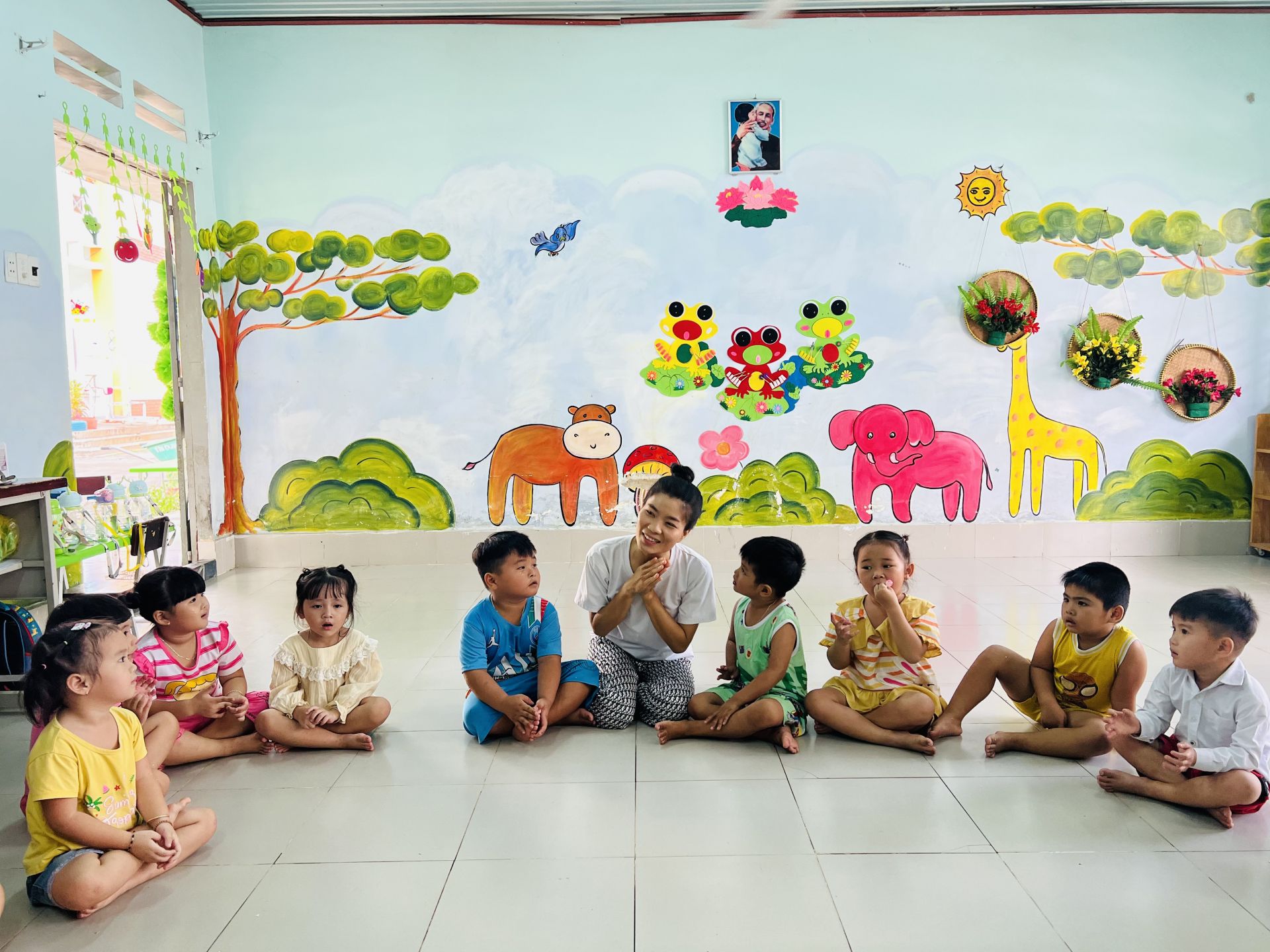 Cô Phạm Thị Diễm An trong tiết học với các bé lớp Chồi 1, trường Mầm non Hoa Mai, huyện Tân Biên.