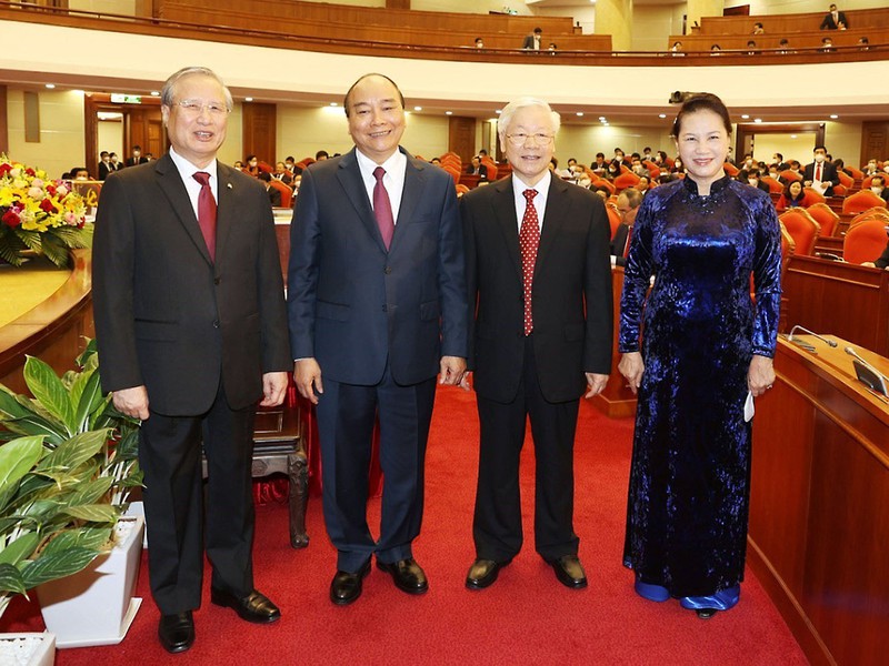 Tổng Bí thư, Chủ tịch nước Nguyễn Phú Trọng, Thủ tướng Chính phủ Nguyễn Xuân Phúc, Chủ tịch Quốc hội Nguyễn Thị Kim Ngân và Thường trực Ban Bí thư Trần Quốc Vượng dự hội nghị. Ảnh: TTXVN