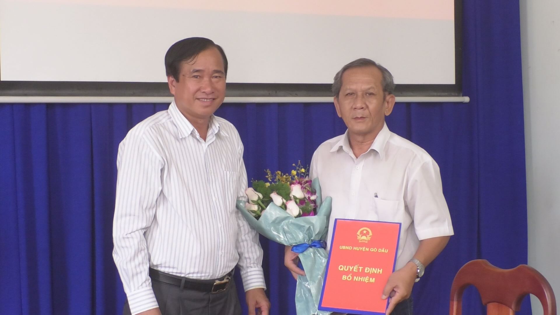 Ông Nguyễn Văn Nhu- Chủ tịch UBND huyện trao Quyết định bổ nhiệm cho ông Nguyễn Văn Bình.