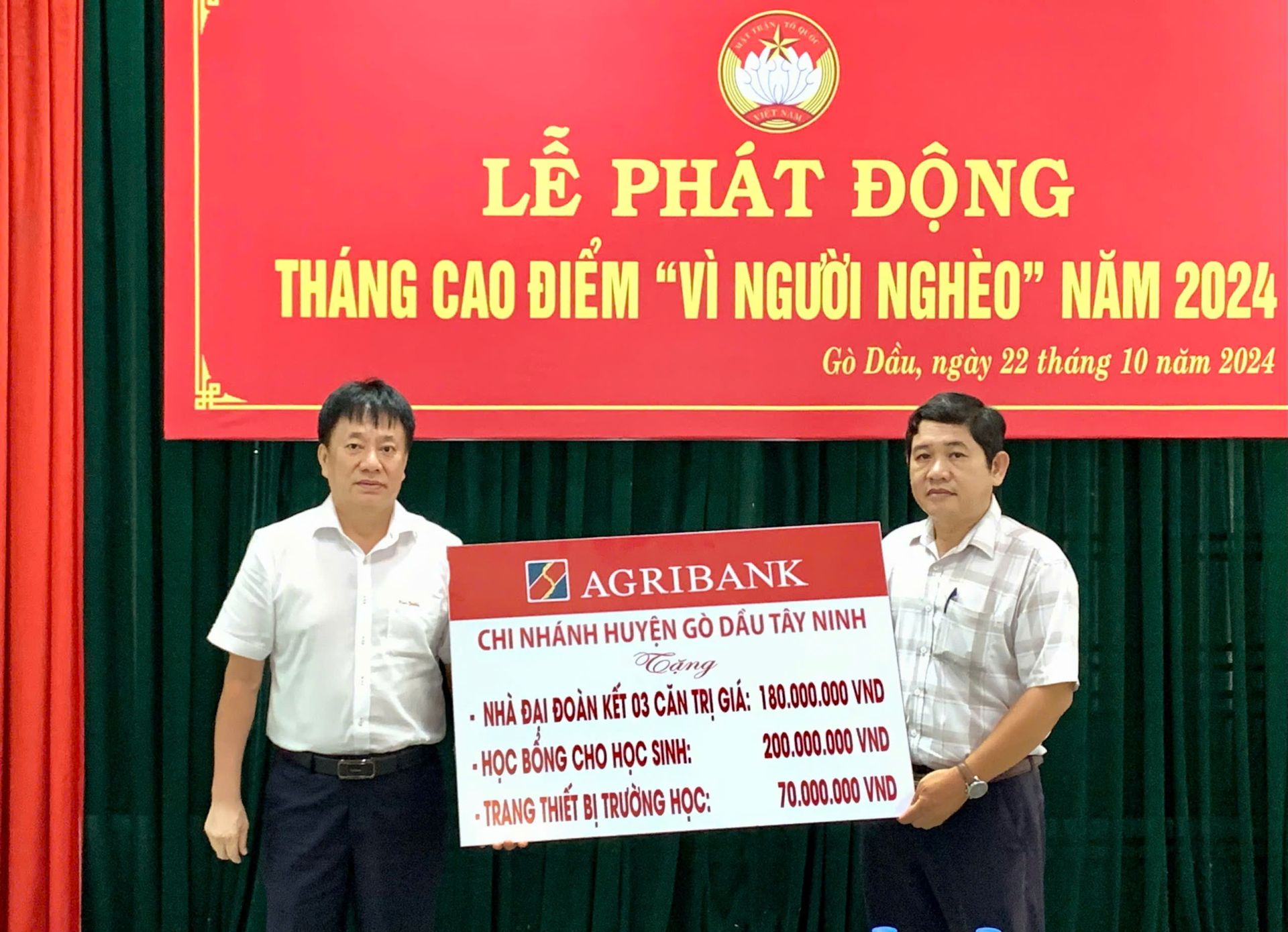 Tại lễ phát động, Ngân hàng Nông nghiệp và Phát triển nông thôn Việt Nam chi nhánh huyện Gò Dầu trao tặng biểu trưng 3 căn nhà đại đoàn kết, 200 suất học bổng và trang thiết bị học tập cho học sinh, tổng trị giá 450 triệu đồng; Ban cai quản họ đạo Cao Đài thị trấn Gò Dầu trao biểu trưng tặng 1 căn nhà đại đoàn kết trị giá 90 triệu đồng; UBND huyện ủng hộ 1 triệu đồng.