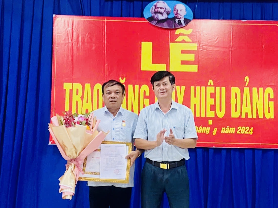 Ông Trần Lê Duy- Bí thư Huyện ủy Tân Biên trao Huy hiệu và tặng hoa chúc mừng đảng viên Mai Xuân Vỹ.
