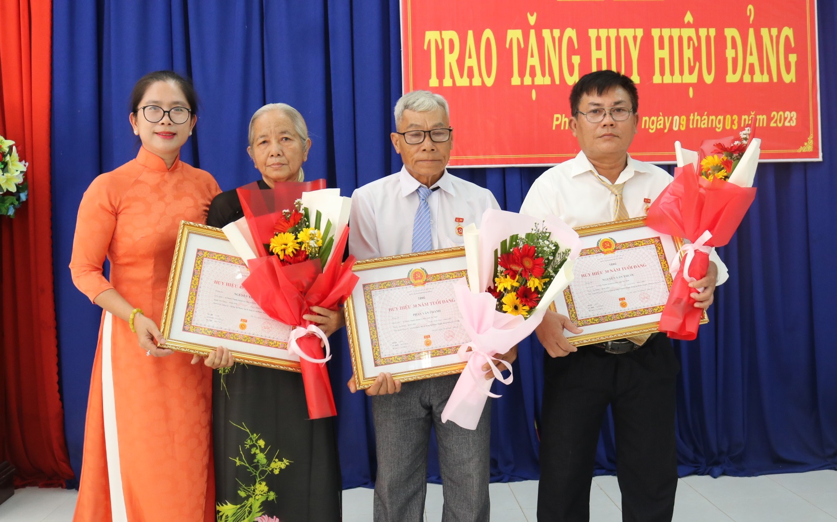 Huy hiệu 30 tuổi Đảng trao cho các đảng viên: Phan Văn Phánh, sinh năm 1964; Nguyễn Văn Thước, sinh năm 1965 và Nguyễn Thành Phương, sinh năm 1969.