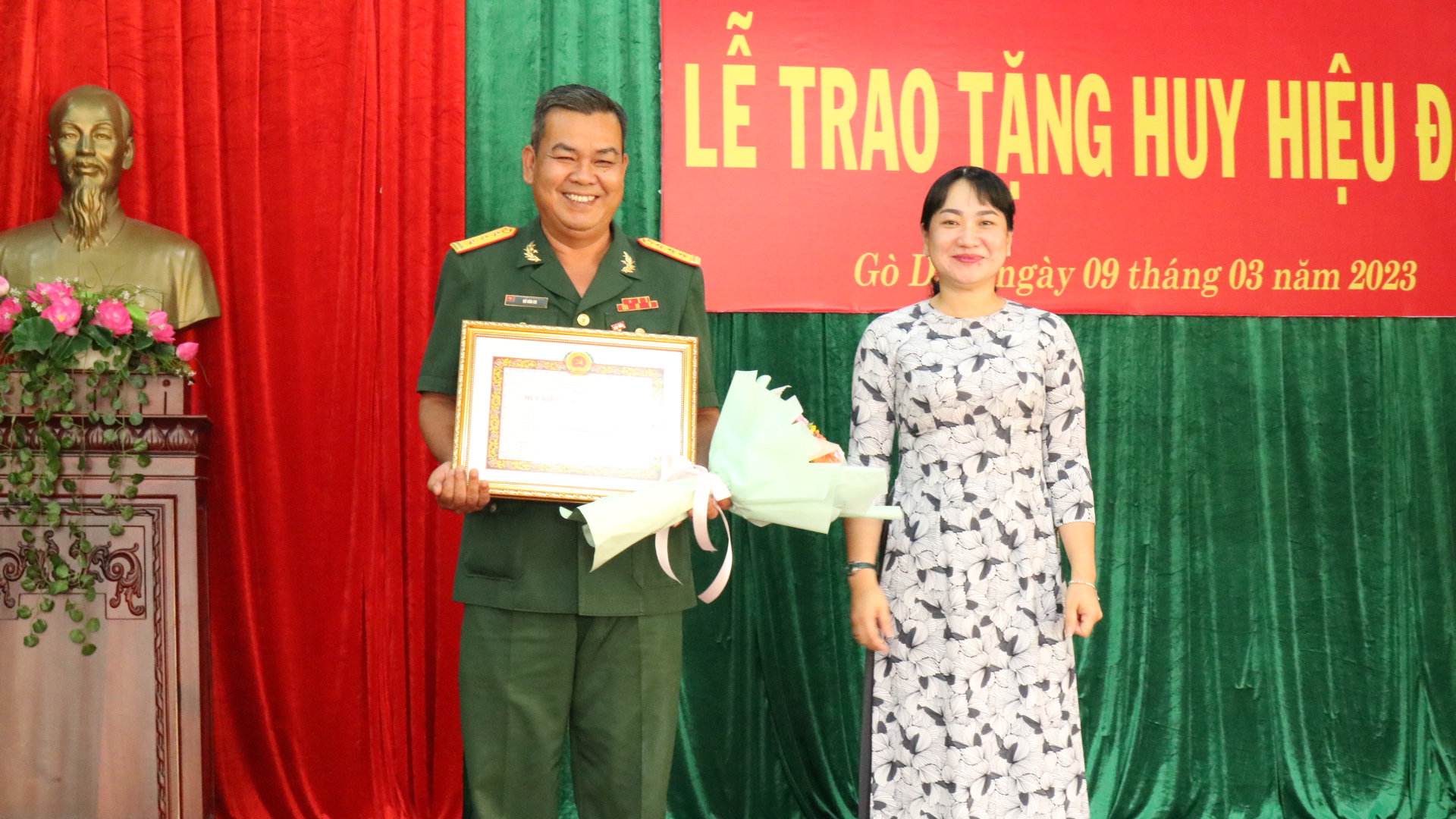 Chiều cùng ngày, Đảng bộ cơ sở Quân sự huyện Gò Dầu tổ chức lễ trao tặng Huy hiệu 30 tuổi Đảng cho đảng viên đảng viên Hồ Văn Cu. Bà Nguyễn Thị Thanh Nhàn- Phó Bí thư Thường trực Huyện uỷ, Chủ tịch HĐND huyện đến dự và trao Huy hiệu.