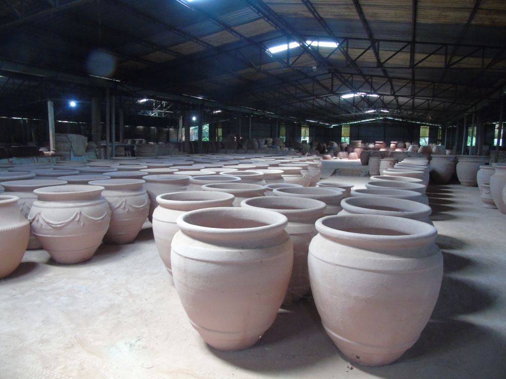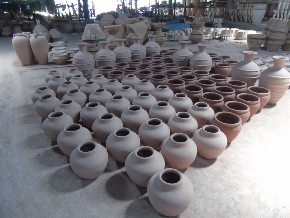Ấn tượng thứ nhất là về độ lớn. Vâng! Bí thư đang khoác vai đi cùng anh chủ lò Võ Văn Việt. Qua một nhà xưởng xếp đầy các loại chum vại, lộc bình to quá cỡ. Đôi lộc bình cao ngang đầu người còn ửng đỏ màu son của đất sét chưa nung. To, mà đủ dạng hình mới lạ.