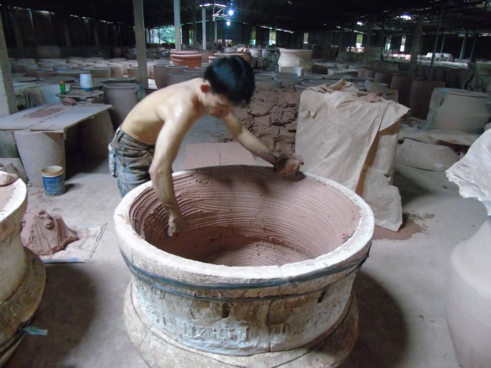 Người thợ phải đi vòng quanh trét từng nắm đất dẻo vào trong. Chợt nhớ, vài lần đi cà phê ở các quán mang tên “Sinh thái”. Thì những nơi ấy bao giờ cũng có các bình, lọ gốm có kích thước lớn để cho nước trong veo giàn giụa chảy trào ra. Kể cả vườn kiểng các đại gia cũng có. Vậy có phải chính nơi này là nơi các đồ gốm điểm trang bậc nhất của sân vườn ấy đã sinh ra?