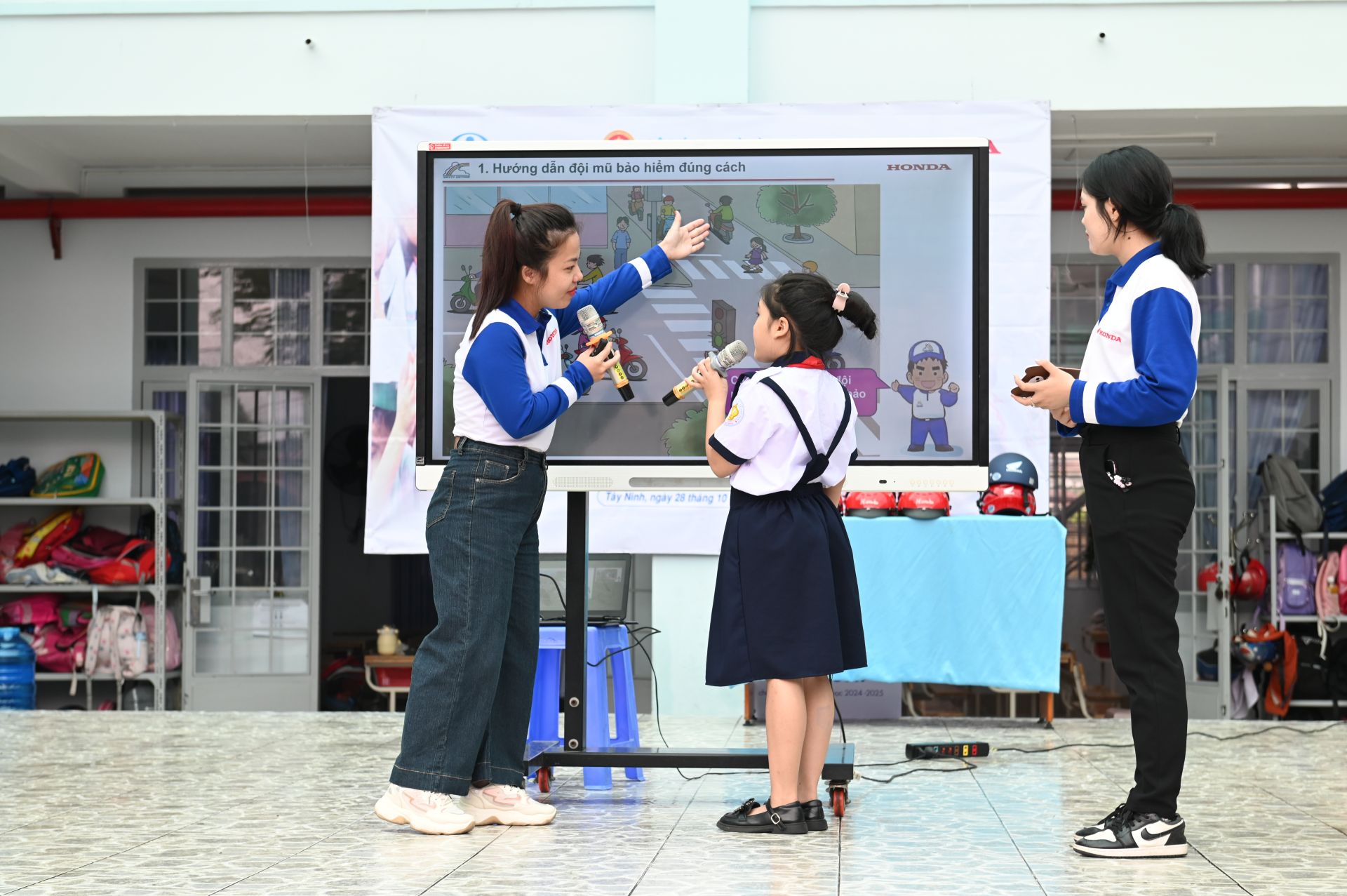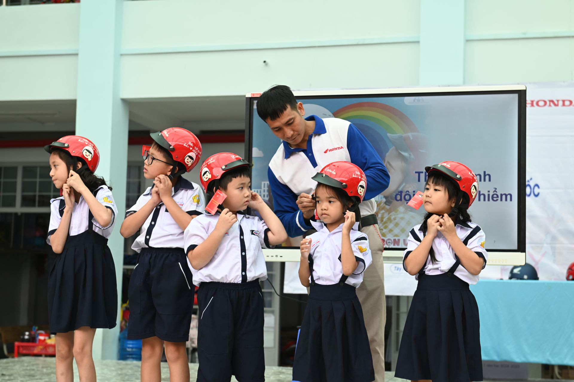 Đại diện Công ty TNHH Hoài Minh 1 hướng dẫn học sinh đội mũ đúng cách. Các em được trang bị kiến thức như tác dụng của MBH, đội MBH khi nào, đội MBH đúng cách… Đồng thời, nhân viên còn hướng dẫn các em học sinh ngồi sau xe đạp, xe gắn máy đúng cách để bảo đảm ATGT khi tham gia giao thông. Xen kẽ trong đó là những trò chơi đố vui, trả lời câu hỏi có thưởng dành cho các em.