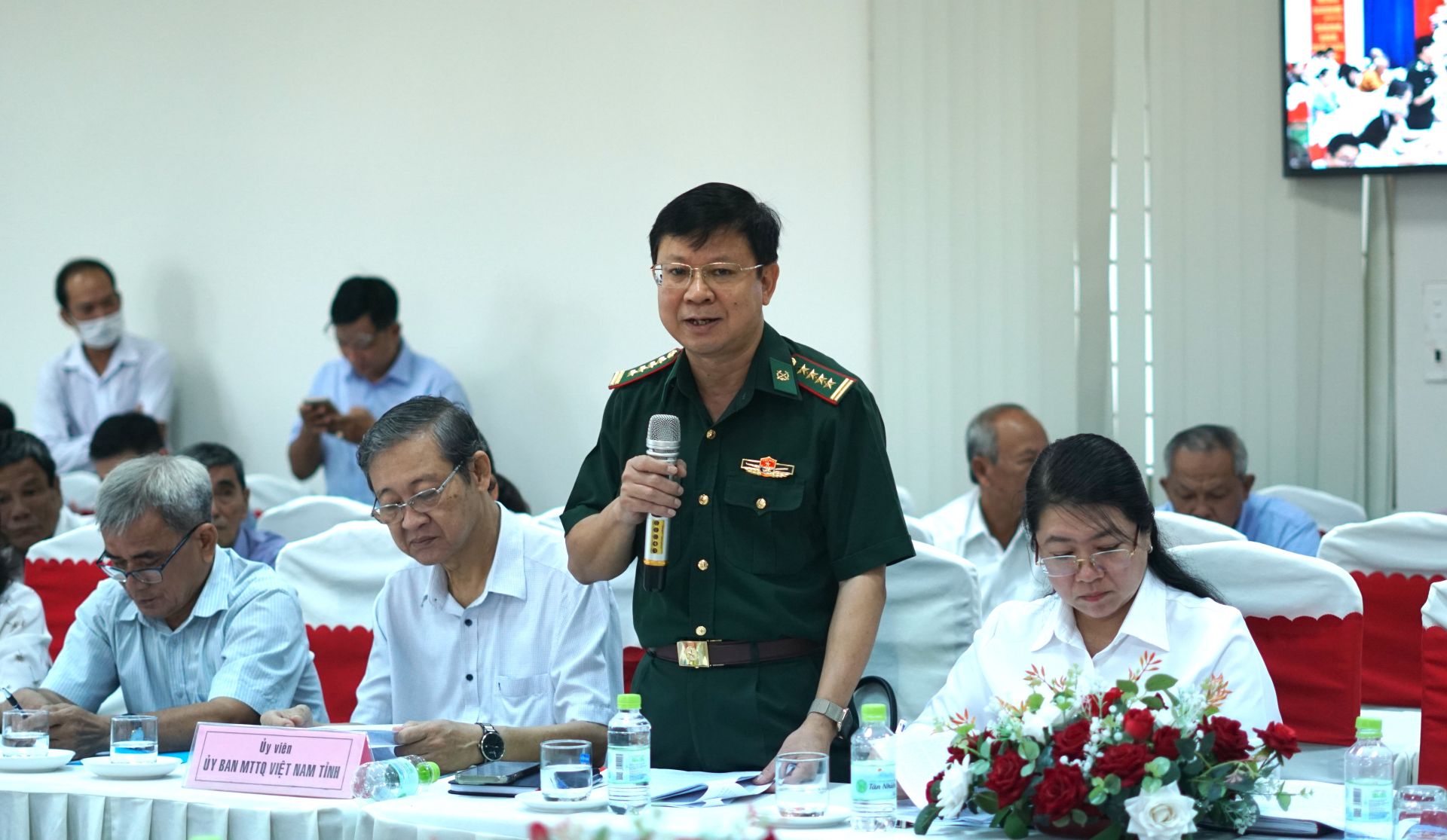 Đại tá Phạm Đình Triệu- Chính uỷ Bộ Chỉ huy BĐBP tỉnh góp ý dự thảo báo cáo chính trị Đại hội MTTQVN tỉnh khoá XI.