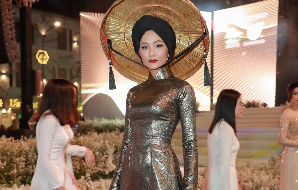 Tại buổi khai mạc Lễ hội Áo dài diễn ra tối 02/03 vừa qua, hoa hậu H’Hen Niê tạo ấn tượng với khán giả bằng bộ áo dài tối màu phong cách Bắc Bộ, kết hợp cùng nón quai thao và khăn vấn mỏ quạ.