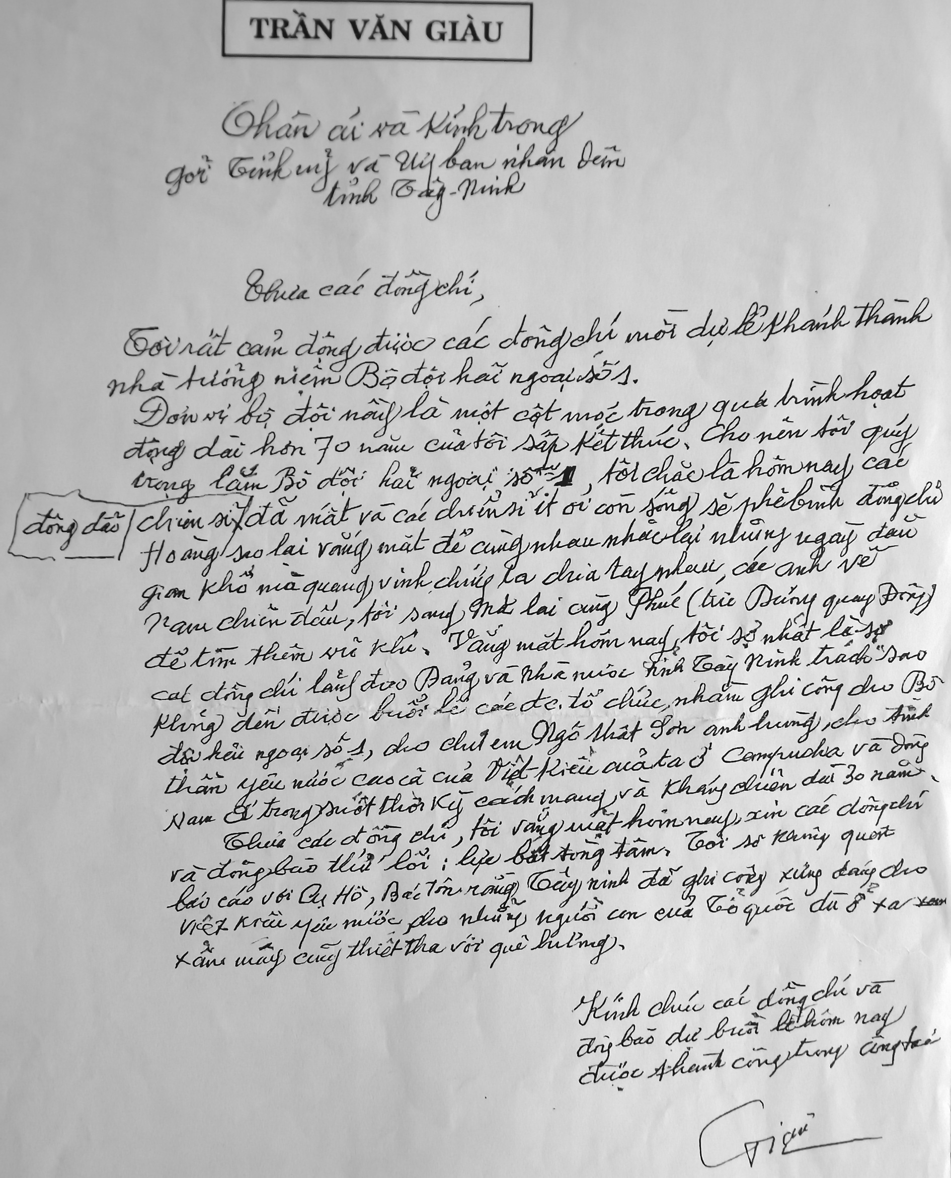 Bút tích thư gửi lãnh đạo Tây Ninh của Giáo sư Trần Văn Giàu.