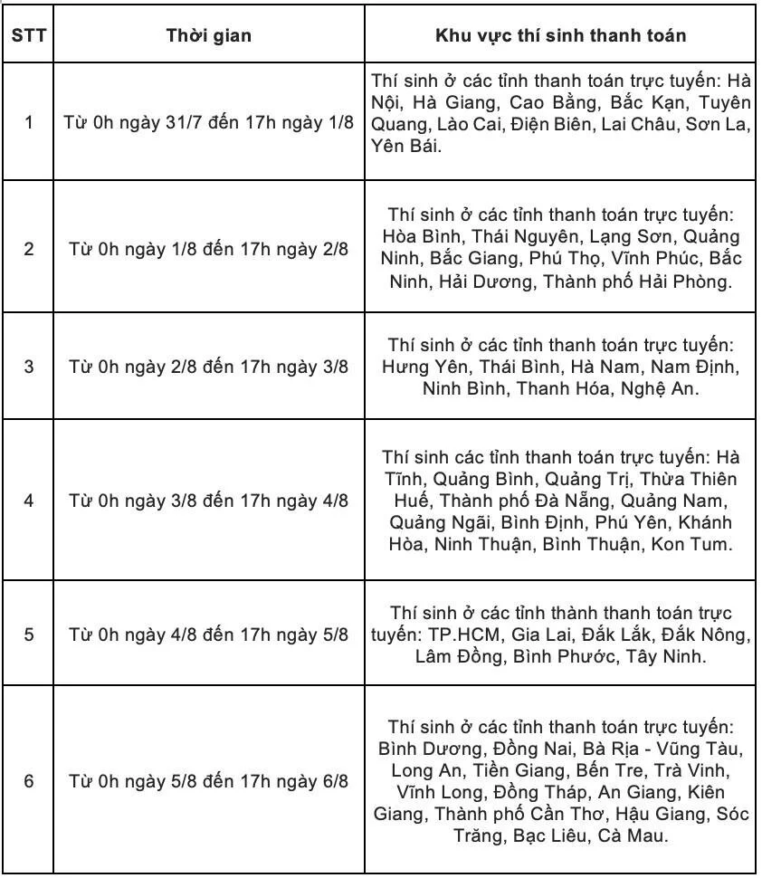 Bộ GD&ĐT chia thành 6 đợt để thí sinh các tỉnh thực hiện thanh toán trực tuyến lệ phí đăng ký nguyện vọng xét tuyển đại học năm 2024. Đây là quy định mới giúp đảm bảo an toàn, thuận lợi cho thí sinh trong quá trình thí sinh thực hiện thanh toán trực tuyến.