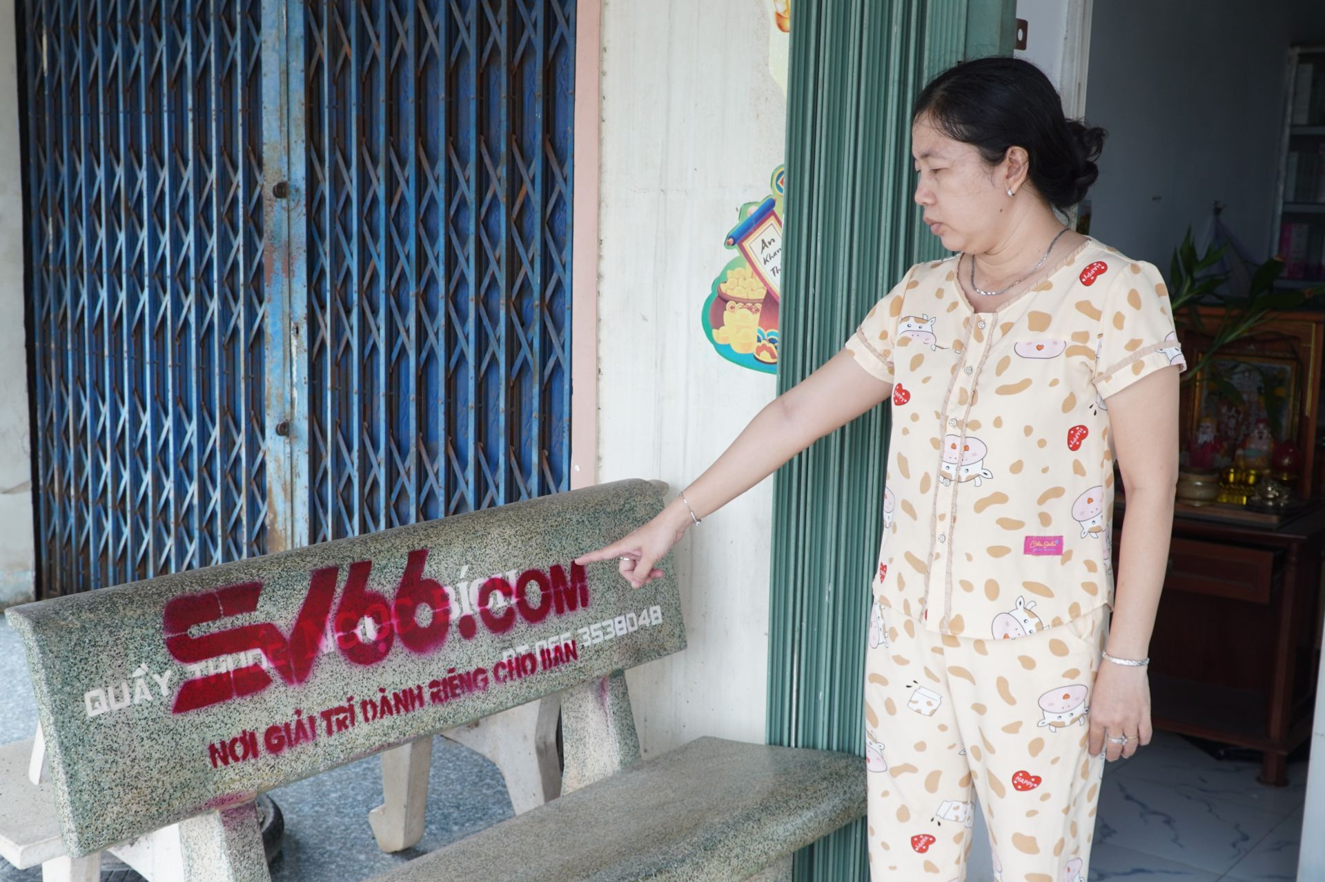 Cách nhà chị Bích không xa, chị Lê Thị Lệ Hằng chủ cửa hàng tạp hoá ở ấp Trà Võ cũng có 2 ghế đá để trước nhà bị xịt sơn. Chị mong cơ quan chức năng nhanh chóng xử lý.