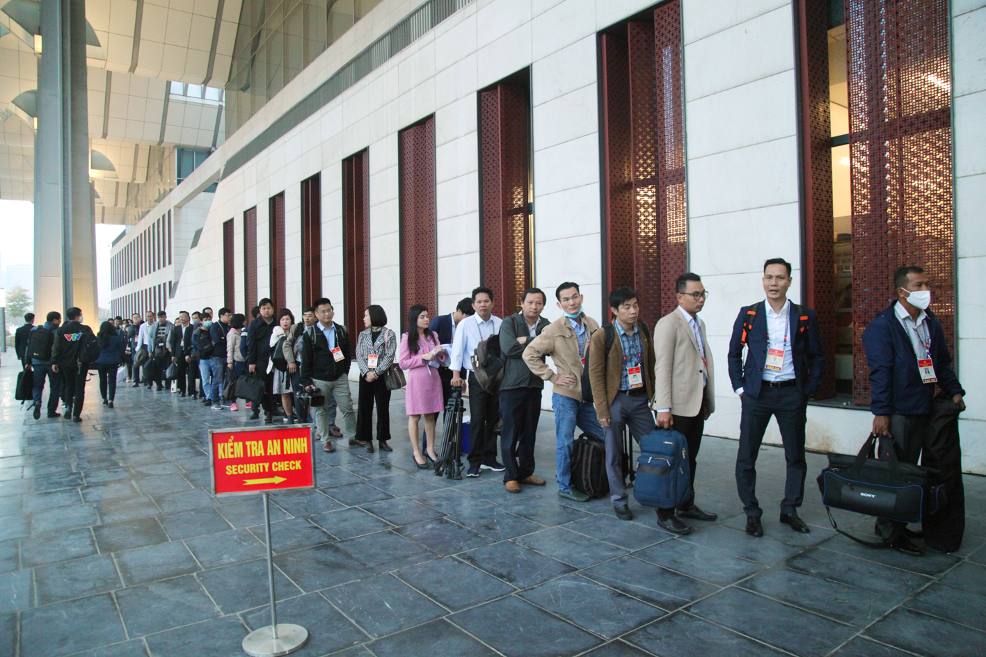 Từ sáng sớm, các phóng viên xếp hành để làm thủ tục kiểm tra an ninh và sức khoẻ trước khi vào tác nghiệp tại Trung tâm báo chí