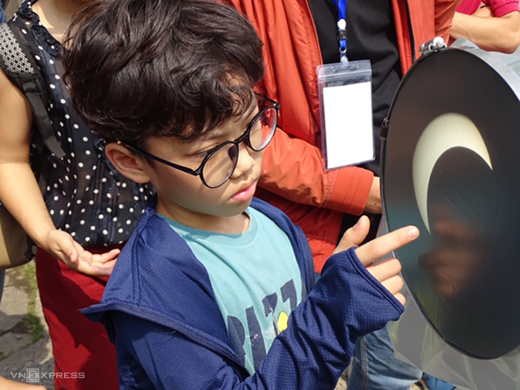 Một em nhỏ xem nhật thực ở mức cực đại qua màn hứng ảnh từ kính thiên văn tại TPHCM. Ảnh: Hà An