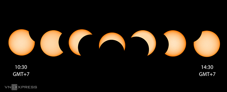 Tổng hợp hành trình Mặt Trăng đi qua phía trước Mặt Trời từ10h30 tới 14h30 ngày 26/12. Ảnh: Phạm Thanh Sơn và Nguyễn Trần Hạ tại TP Vũng Tàu (Việt Nam).