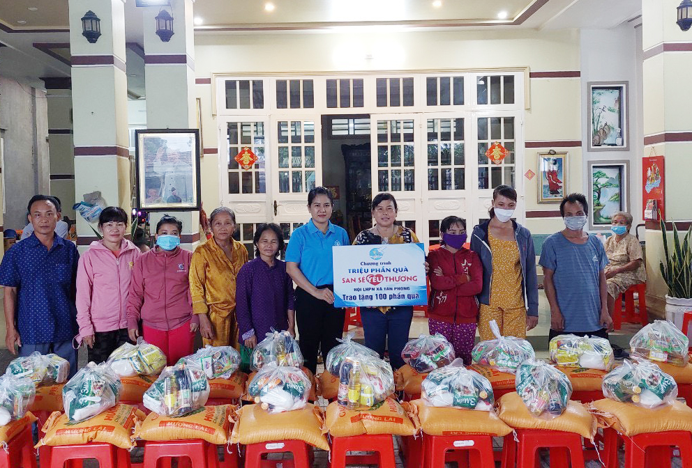 Chị Hạnh tặng quà cho những hộ gia đình có hoàn cảnh khó khăn trên địa bàn xã Tân Phong.