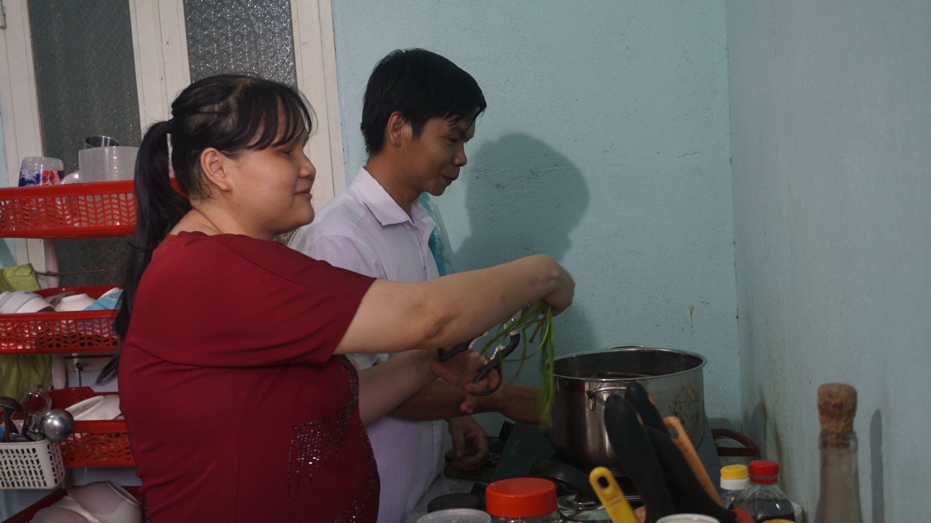 Vợ chồng chị Trương Thị Kim Ngân, anh Lê Hữu Tâm chuẩn bị bữa cơm chiều.