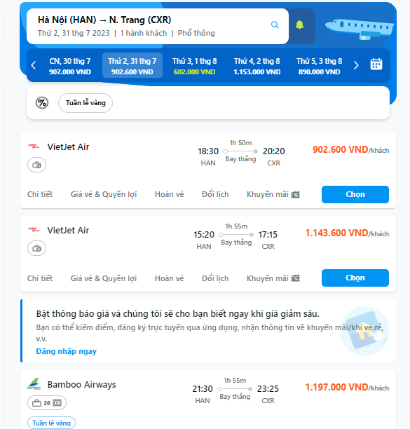 - Vé máy bay Hà Nội (HAN) → N. Trang (CXR): 902.600 - 17.248.000 VND/khách/vé/chiều;
