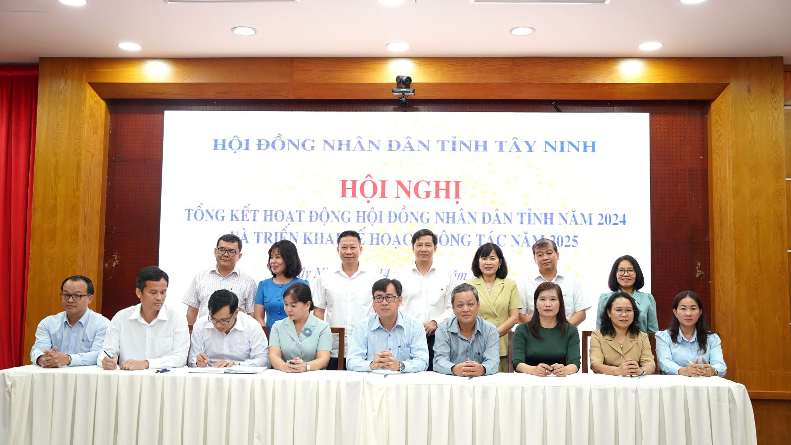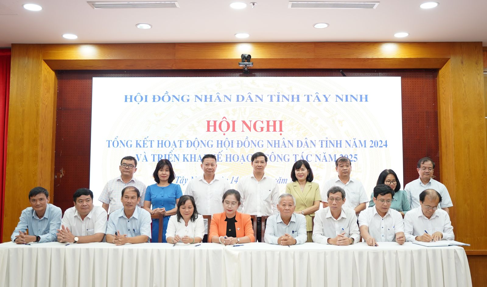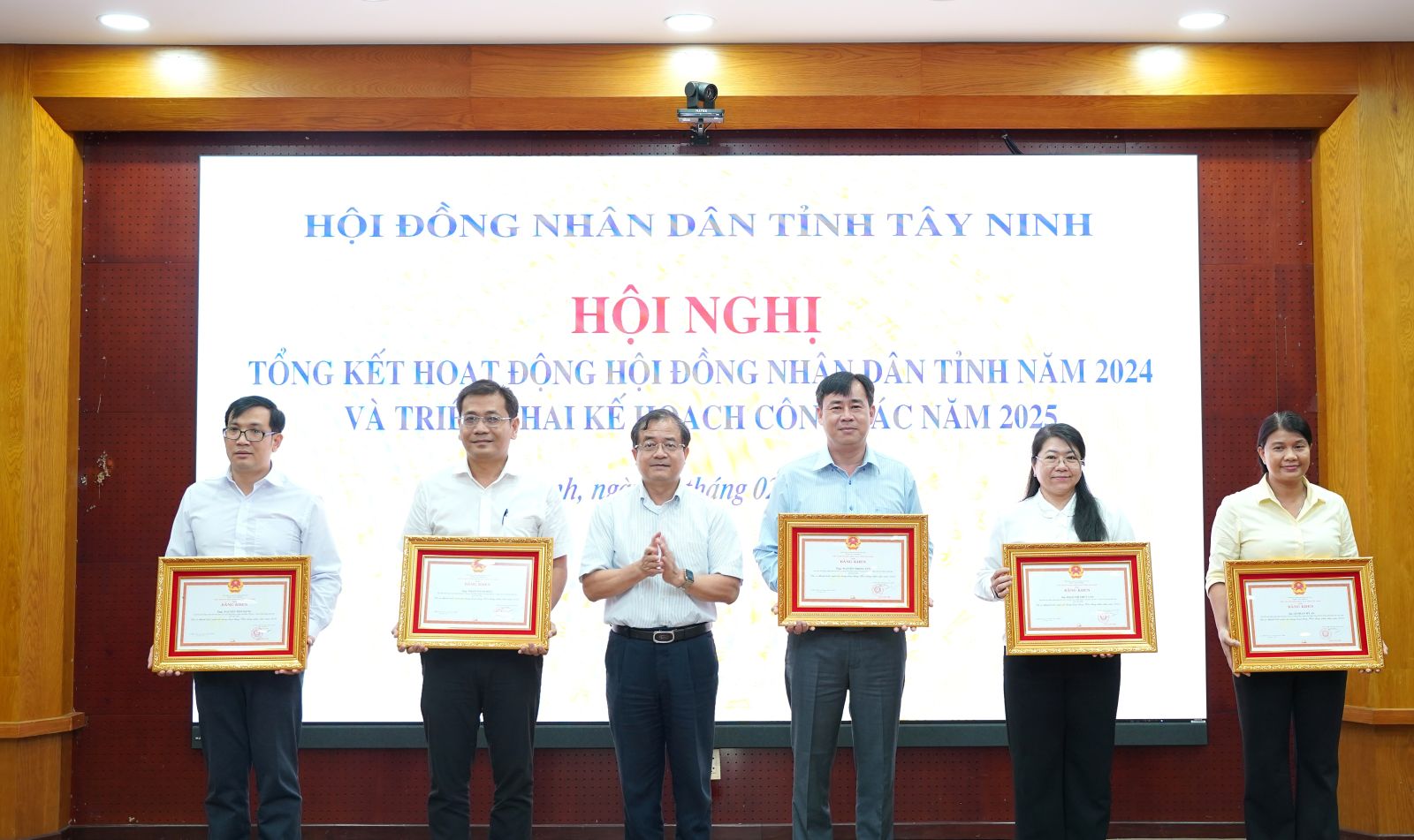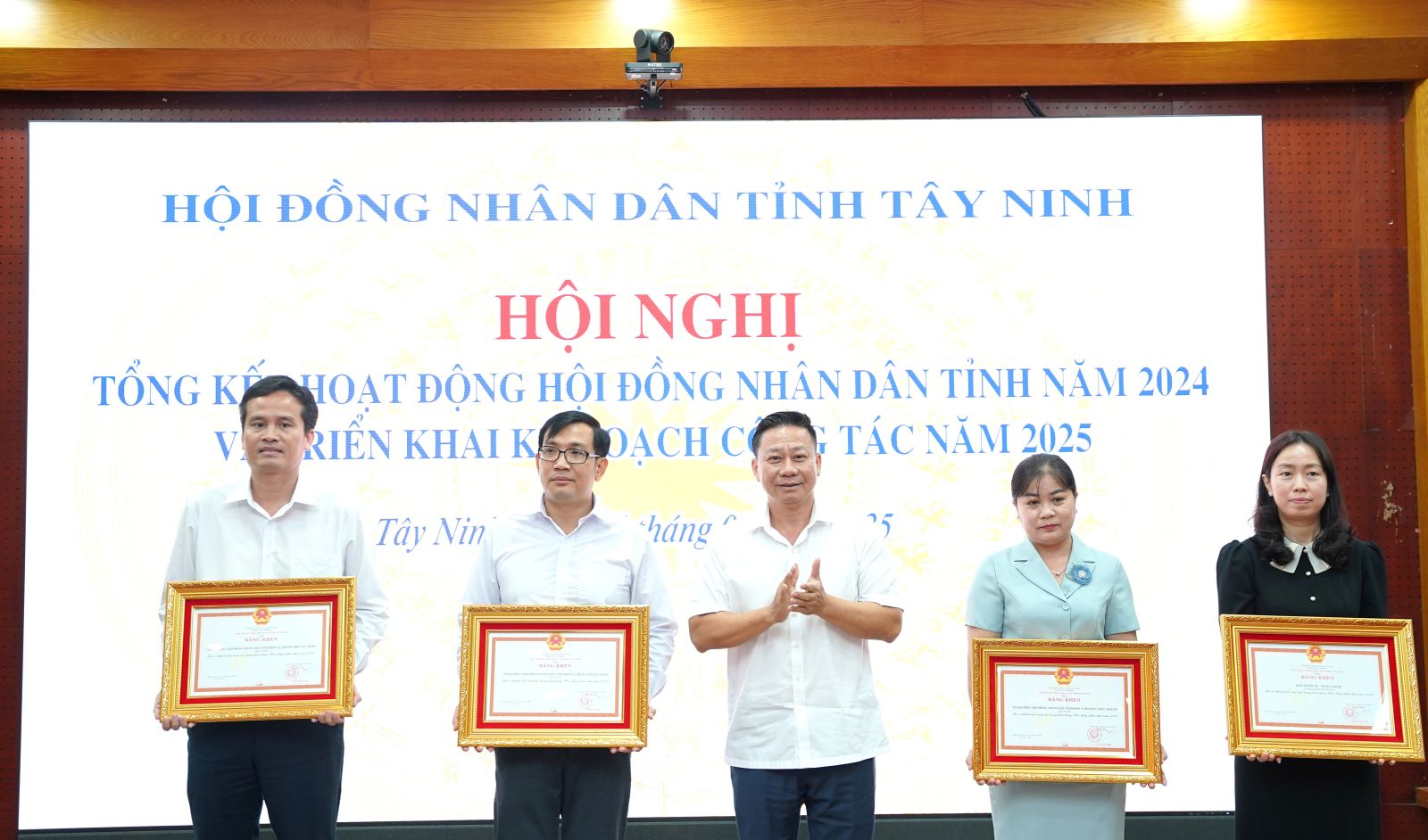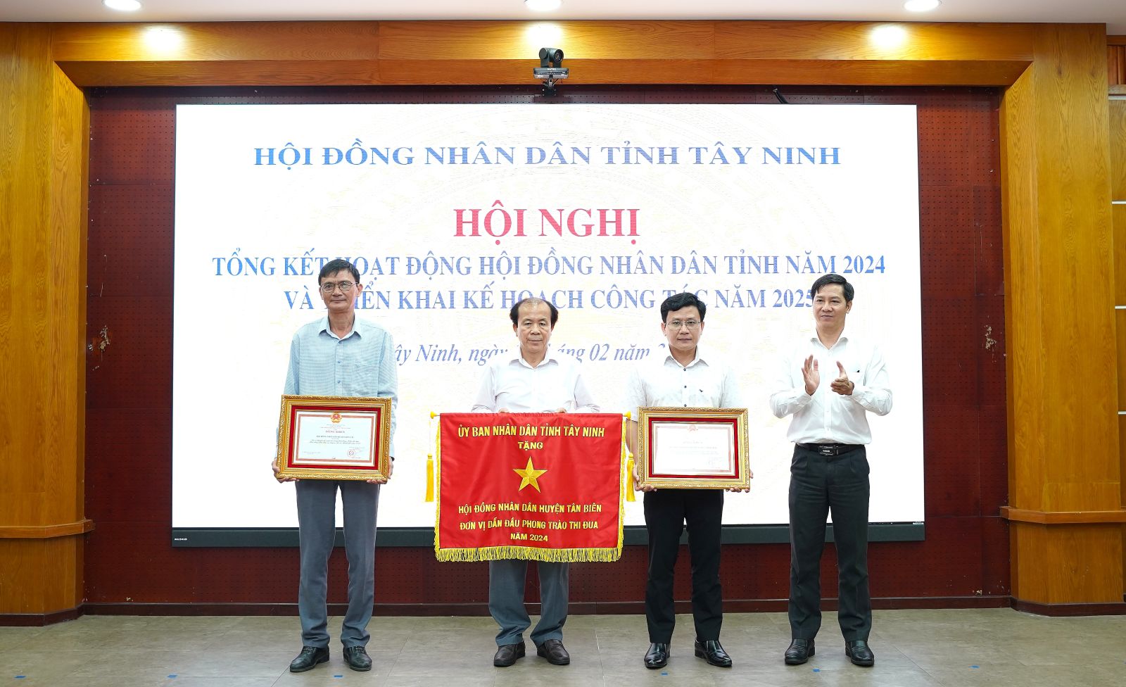 Dịp này, Thường trực HĐND tỉnh và UBND tỉnh trao tặng Cờ đơn vị “Dẫn đầu phong trào thi đua” cho HĐND huyện Tân Biên và bằng khen cho 2 tập thể là HĐND huyện Dương Minh Châu, HĐND huyện Bến Cầu; tặng bằng khen của Chủ tịch UBND tỉnh cho các tập thể, cá nhân có thành tích tiêu biểu, nổi bật trong hoạt động HĐND tỉnh năm 2024; tổ chức ký kết giao ước thi đua năm 2025.