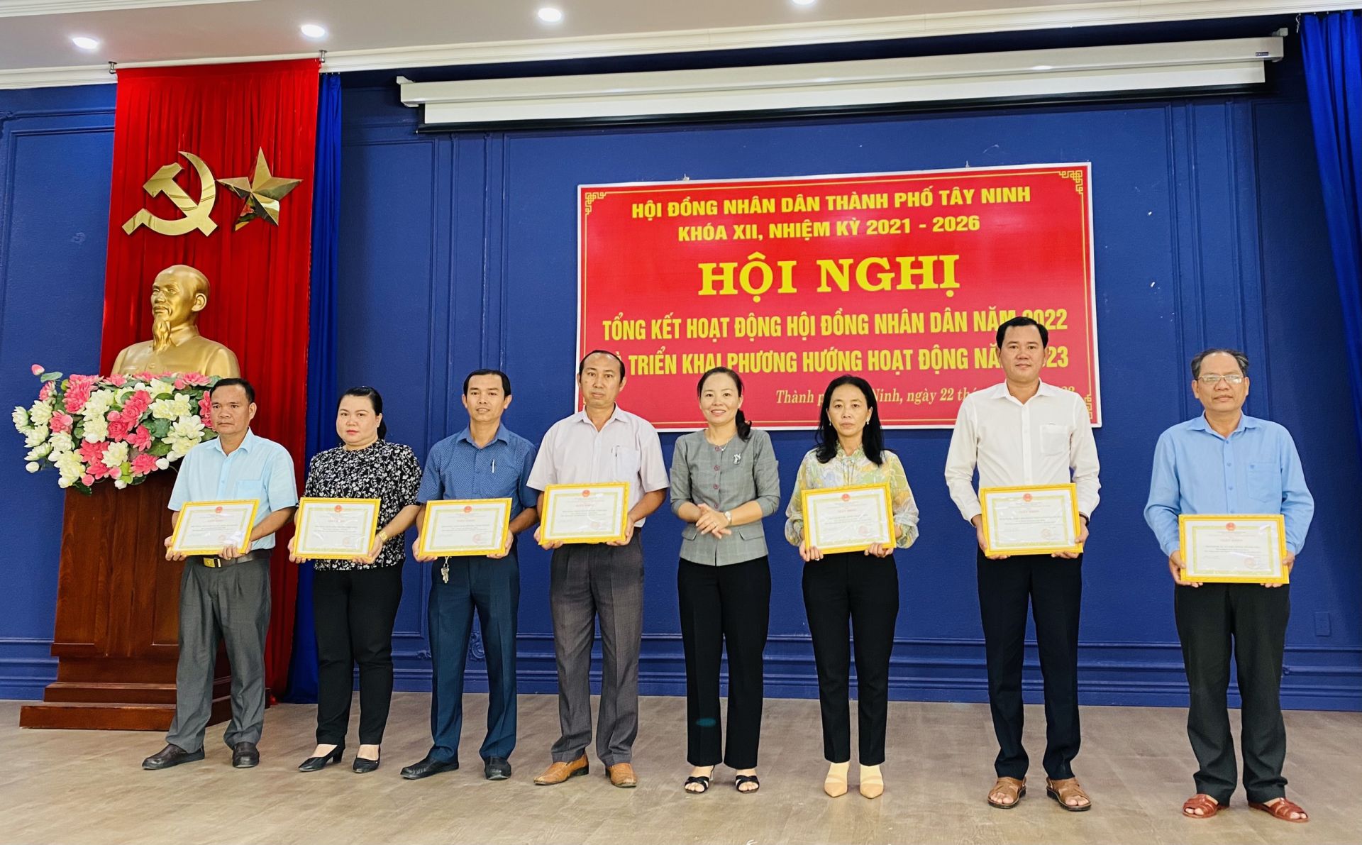 Bà Nguyễn Thị Hồng Loan–Phó Bí thư Thường trực Thành ủy, Chủ tịch HĐND Thành phố Tây Ninh trao tặng giấy khen cho các tập thể có thành tích trong hoạt động HĐND thành phố và phường, xã năm 2022.