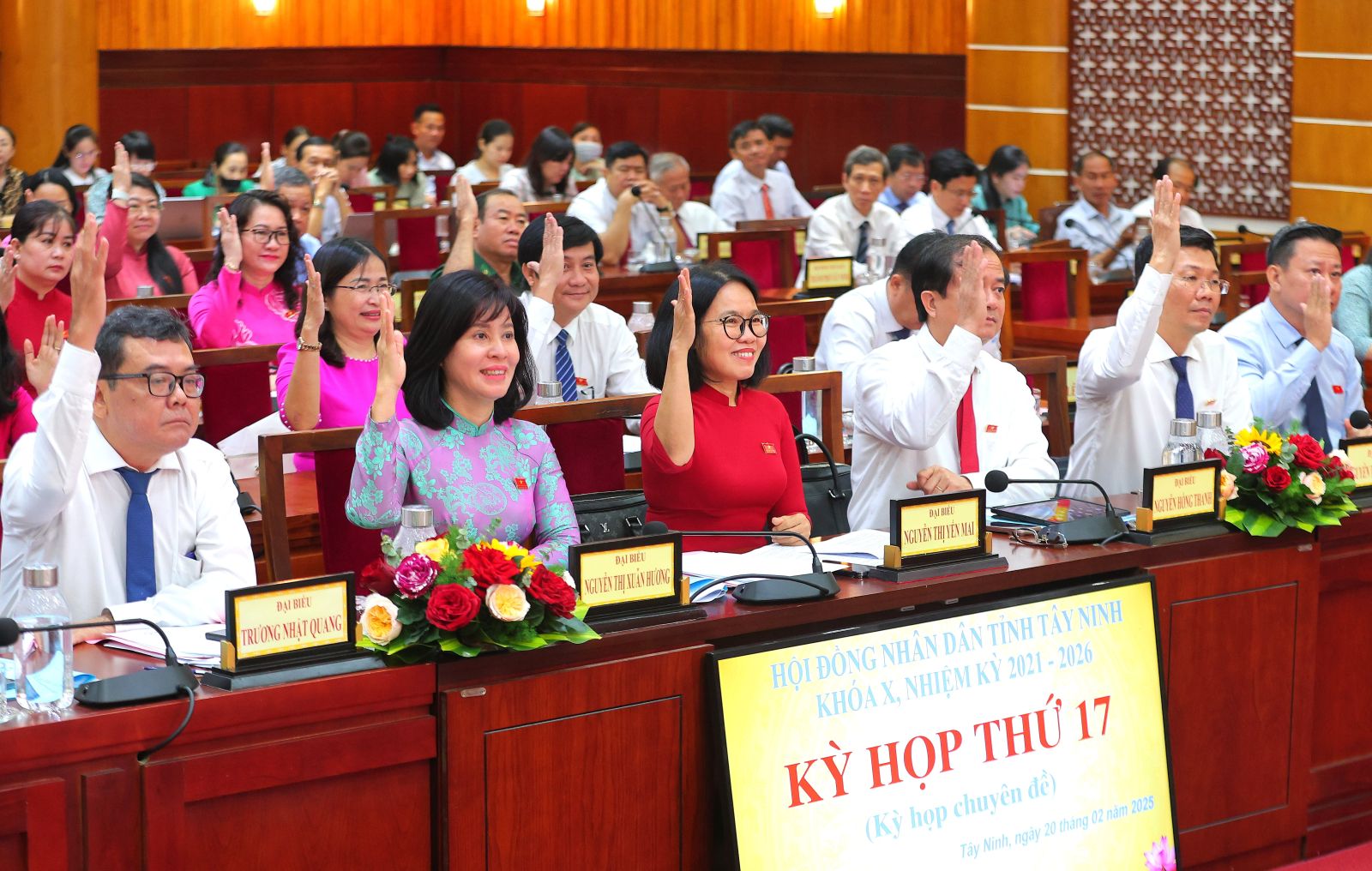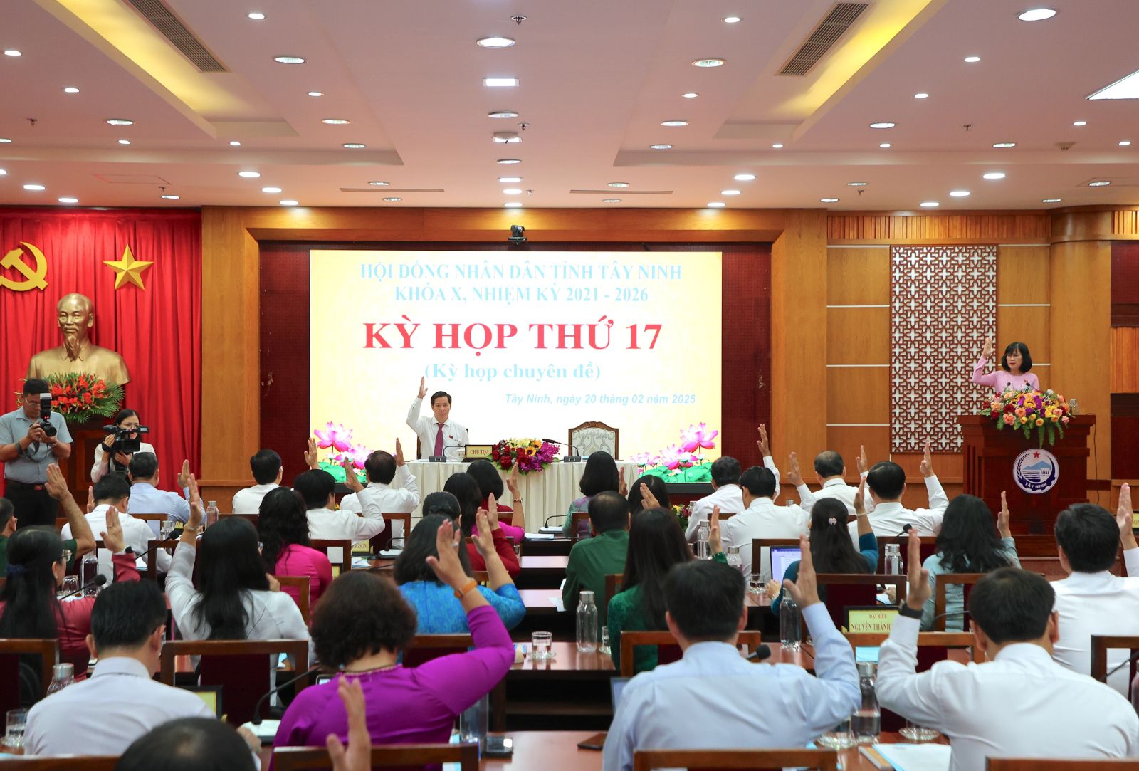 3 nghị quyết chuyên đề được thông qua tại kỳ họp thứ 17 HĐND tỉnh khoá X gồm: Nghị quyết điều chỉnh Nghị quyết số 197/NQ-HĐND ngày 6.12.2024 của HĐND tỉnh về kế hoạch phát triển kinh tế - xã hội năm 2025; Nghị quyết bãi bỏ Nghị quyết số 26/2022/NQ-HĐND ngày 12.5.2022 của HĐND tỉnh về việc giao UBND tỉnh quyết định chủ trương đầu tư các dự án đầu tư công trên địa bàn tỉnh Tây Ninh; Nghị quyết về việc tổ chức lại các cơ quan chuyên môn thuộc UBND tỉnh. |