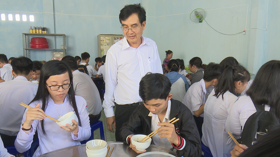 “Lúc mới về trường, tôi chứng kiến cảnh nhiều em học sinh học hai buổi ở lại trường phải ăn trưa bằng bánh mì, mì gói hay cơm tiệm… Tôi đã suy nghĩ tìm cách nào để các em nhà xa được ăn uống đầy đủ, nghỉ ngơi buổi trưa phù hợp. Ý tưởng mở bếp ăn tại trường, lo bữa trưa cho học sinh xuất phát từ đây. May mắn thay, ý tưởng của tôi nhận được sự đồng tình của đoàn thể, phụ huynh và nhà hảo tâm. Trong năm học 2009-2010, nhà trường phối hợp với Ban đại diện cha mẹ học sinh, Ðoàn Thanh niên, Hội Chữ thập đỏ xây dựng bếp ăn thân thiện”- thầy Quây kể tiếp.