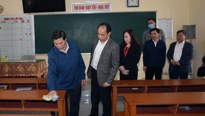 Tại thời điểm đoàn đến kiểm tra, nhà trường vẫn chưa tiến hành dọn dẹp tổng vệ sinh tại khu vực lớp học, bàn ghế chưa được lau chùi có nhiều bụi bẩn, bề mặt sàn các lớp học trong tình trạng nhếch nhác.