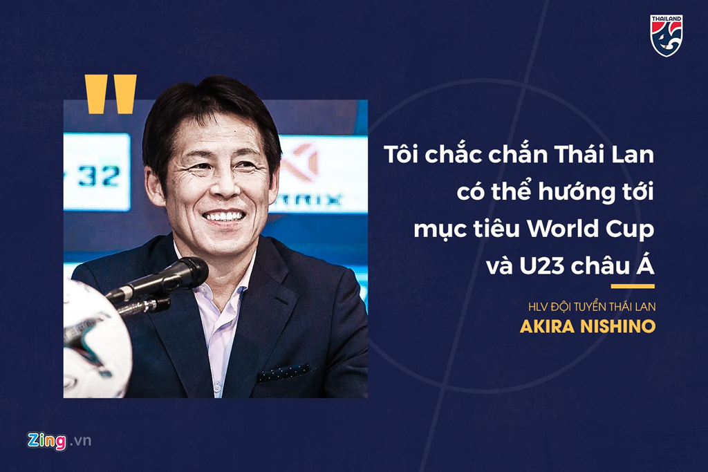Chia sẻ với truyền thông Thái Lan trong buổi họp báo ra mắt với cương vị HLV trưởng đội tuyển quốc gia, ông Nishino cho biết: "Lúc này, có thể còn quá sớm để nghĩ đến mục tiêu dài hạn, nhưng tôi cùng các cầu thủ sẽ cố gắng làm việc hàng ngày. Thái Lan muốn lọt vào nhóm 12 đội giành quyền đi tiếp. Trong đó, mục tiêu đầu tiên của tôi là đánh bại đội tuyển Việt Nam".