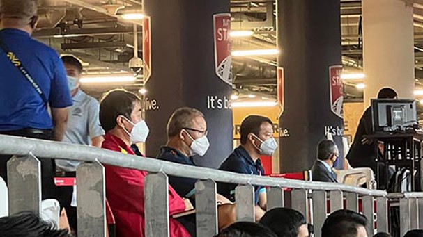 HLV Park Hang-seo cùng các cộng sự đã tranh thủ đến sân vận động QG Singapore để theo dõi Thái Lan đá với chủ nhà Singapore trong trận cuối vòng bảng bảng A AFF Cup 2020.